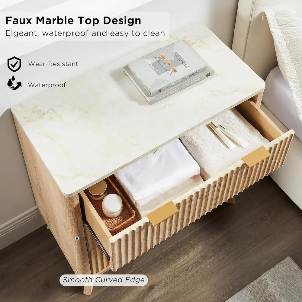 32" Tall Fluted Nightstand Set of 2, Modern Side Table with Faux Marble Top, 3 Drawers End Table w/Storage, Nightstands