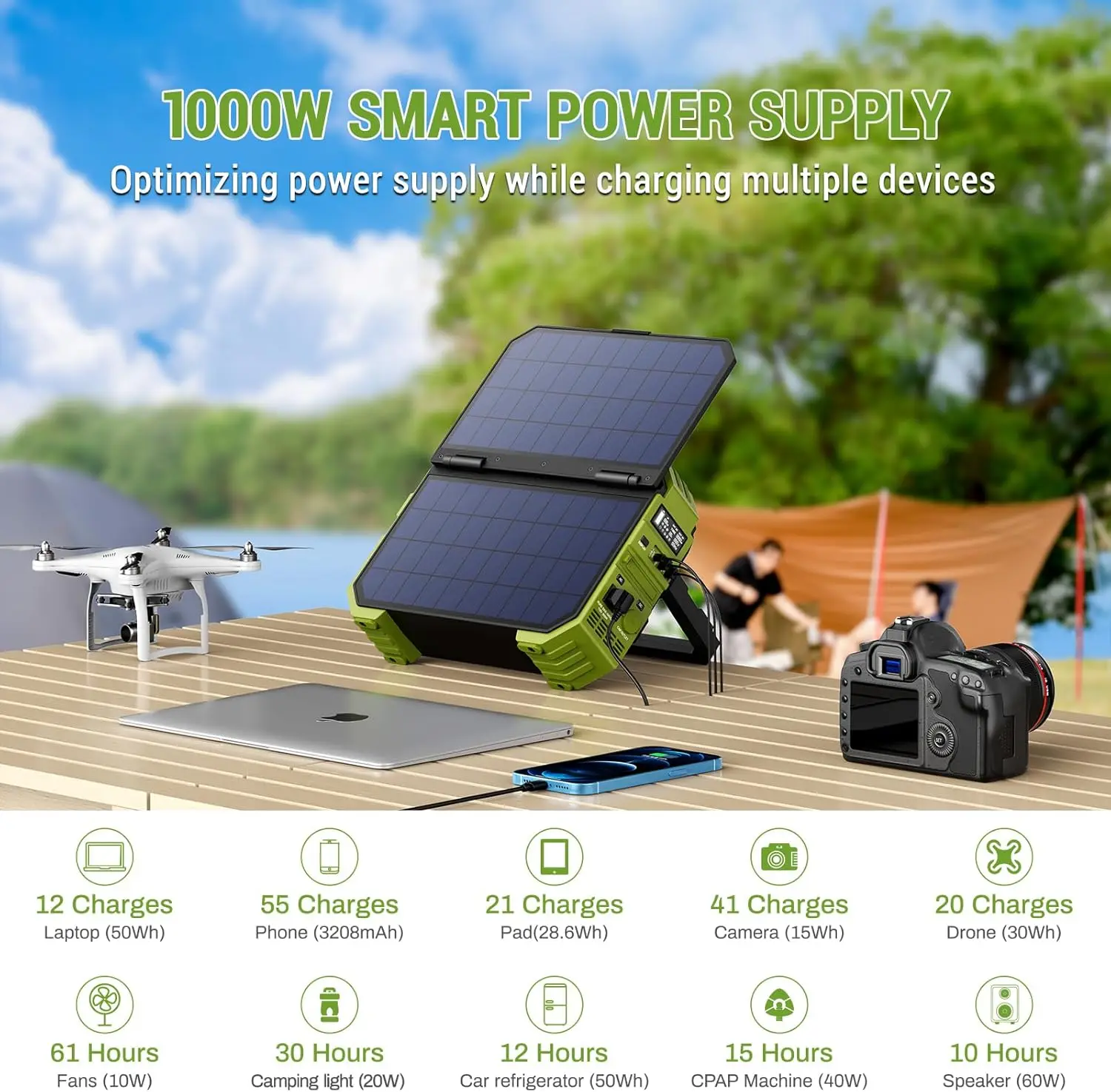 【Powerful, Versatile Solar Generator】With a 614.4Wh capacity and 1000W pure sine wave AC inverter (2000W surge), our solar powered generator can power up to 7 devices simultaneously(≤1000W), including laptops, phones, lights, fans, cameras, CPAP machines, mini-refrigerators, and more