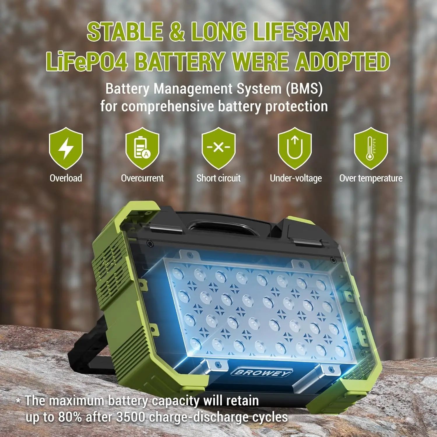 【Long-Lasting, Safe LiFePO4 Battery】Enjoy up to 10 years of everyday use with our high-safety lithium iron phosphate batteries, which can withstand over 3500 cycles. Even after 3500+ cycles, the LFP battery of portable power station remains around 80% of its original capacity. Advanced BMS protection system that monitors voltage, current, and temperature to minimize problems caused by charging or power supply.