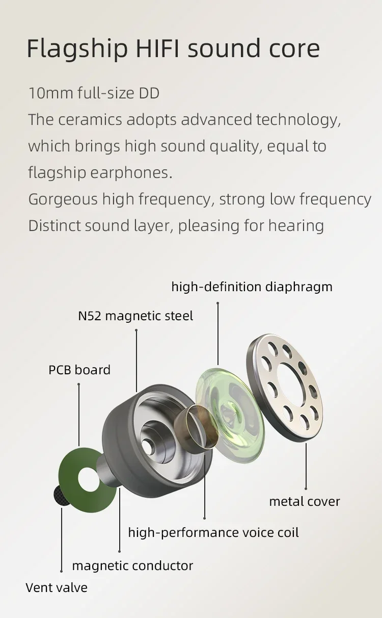 Flagship hifi sound core: 10mm full-size moving coil, advanced technology to bring the sound quality of flagship headphones. Let the high frequency bright and gorgeous, low frequency surging and strong. The sound is layered and pleasing to the ear.