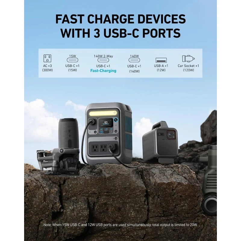 8 Device Charging Ports: Power all your tech with versatile ports, including 3× AC (300W), 1× car socket (120W), 2× USB-C (140W), 1× USB-C (15W), and 1× USB-A (12W).