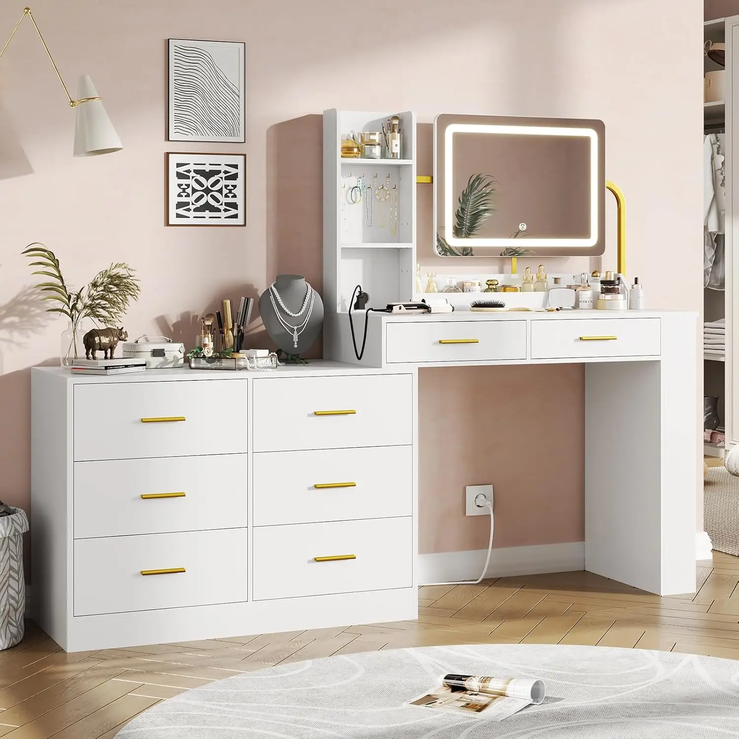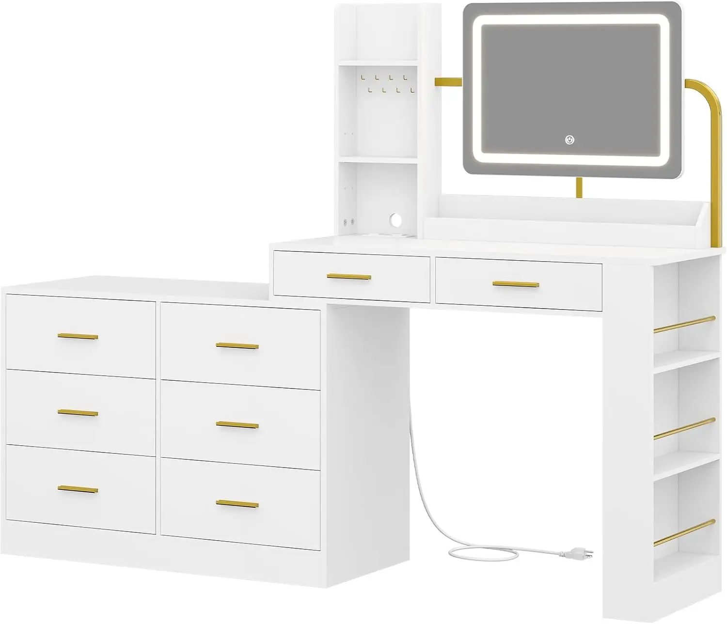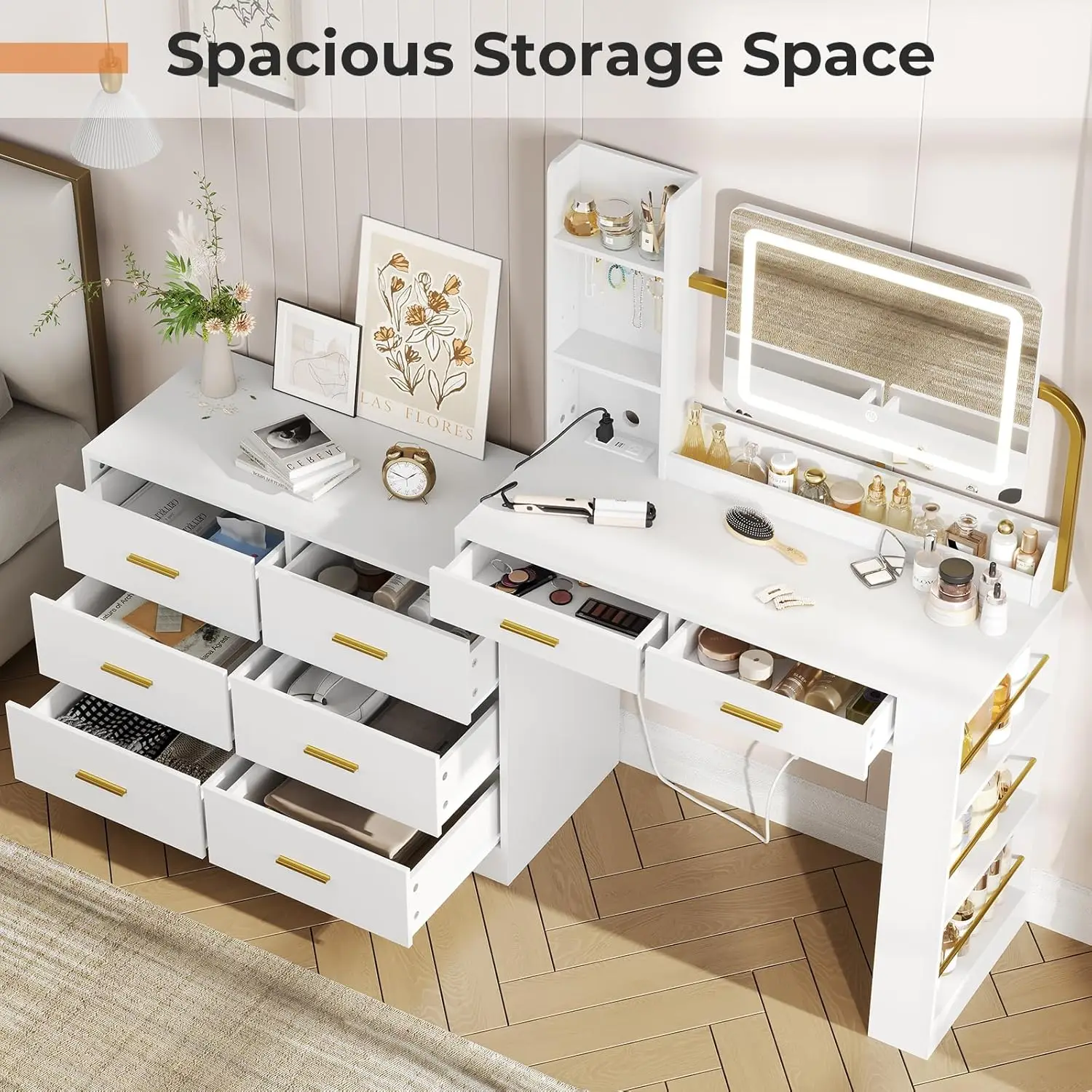 Vanity Desk w/ Mirror & Lights, White Makeup Dressing Vanity Table w/ Charging Station, 8 Drawers, 3 Tiers Tabletop Shelves