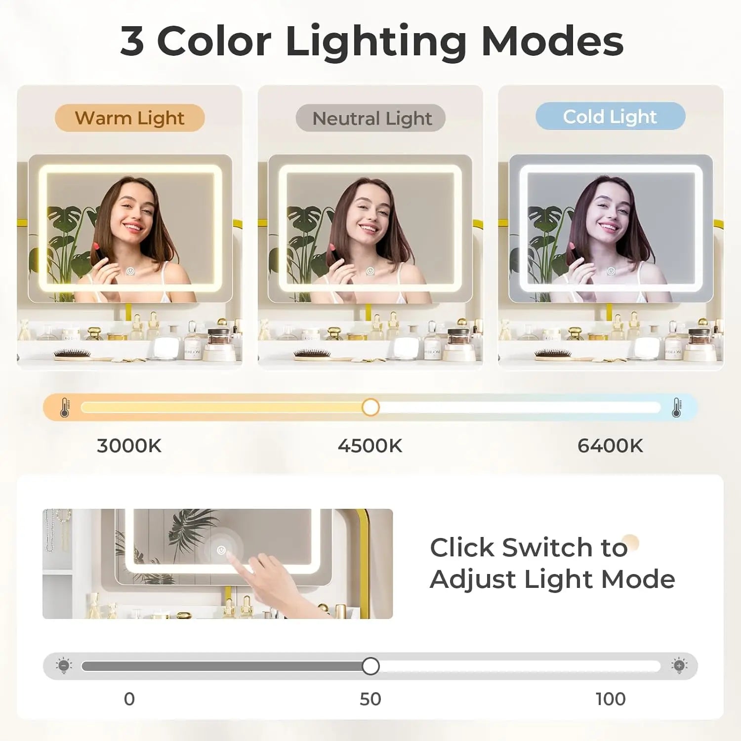 - 【3 Lighting & Brightness Adjustable】The high-definition mirror is surrounded by ten LED lights, which can be switched 3 color temperatures, you can change the color or brightness according to any scene or makeup needs, which allows you to control the lighting and room atmosphere better and helps you create the best makeup look every day.